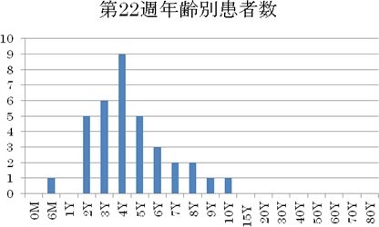 2012年に入り報告数減少し、10件前後で推移し、第8週10件、第9週17件、第10週9件でした。第11週は22件(定点当り2.44)とやや増加し、第12週19件(定点あたり2.11)、第13週では17件(定点あたり1.89)、14週で13件(定点あたり1.44)、第15週で14件(定点あたり1.56)、第16週で10件(定点あたり1.11)でした。第17週で11件(定点あたり1.22)、第18週(定点あたり1.22)で11件、第19週では14件の報告がありました。第20週で26件と増加していましたが、第21週で13件と半減しています。しかしながら、第22週で35件(定点あたり3.89)と増加しています。