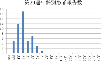 2012年に入り報告数減少し、10件前後で推移し、第8週10件、第9週17件、第10週9件でした。第11週は22件(定点当り2.44)とやや増加し、第12週19件(定点あたり2.11)、第13週では17件(定点あたり1.89)、14週で13件(定点あたり1.44)、第15週で14件(定点あたり1.56)、第16週で10件(定点あたり1.11)でした。第17週で11件(定点あたり1.22)、第18週(定点あたり1.22)で11件、第19週では14件の報告がありました。第20週で26件と増加していましたが、第21週で13件と半減しています。しかしながら、第22週35件(定点あたり3.89)、第23週21件と増加しています。第24週では14件(定点あたり1.56)と減少傾向です。第25週で22件(定点あたり2.44)と増加し、第26週では10件(定点あたり1.11)と再び減少していましたが、第27週で19件(定点あたり2.11)と増加しています。第28週では11件(定点あたり1.22)、第29週では6件(定点あたり0.67)でした。