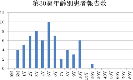 第28週15件(定点あたり1.67)、第29週50件(定点あたり5.56)、第30週80件(定点あたり8.89)と増加が続いています。第30週は、流行発生警報基準値(定点あたり6)を超えました。
