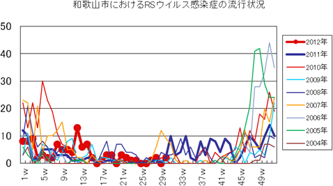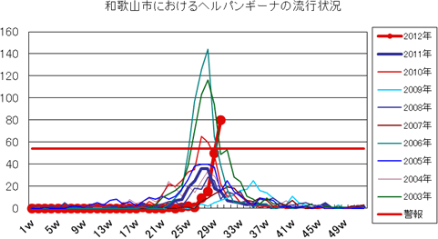 和歌山市は、2012年第5週は7件の報告がありました。第5週以降、第8週0件、第9週0件、第10週2件、第11週2件(定点当り0.67)、第12週4件、第13週で1件、14週で0件、第15週で1件、第16週で3件、第17週で2件、第18週で1件、第19週で0件でした。第20週も0件でした。第21週では2件の報告がありました。第22週、第23週、第24週では報告がありませんでした。第25週は1件、第26週以降の報告はありません。