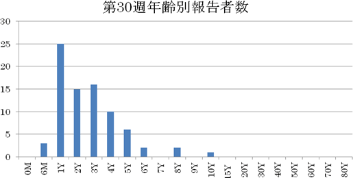 2012年に入り報告数減少し、10件前後で推移し、第8週10件、第9週17件、第10週9件でした。第11週は22件(定点当り2.44)とやや増加し、第12週19件(定点あたり2.11)、第13週では17件(定点あたり1.89)、14週で13件(定点あたり1.44)、第15週で14件(定点あたり1.56)、第16週で10件(定点あたり1.11)でした。第17週で11件(定点あたり1.22)、第18週(定点あたり1.22)で11件、第19週では14件の報告がありました。第20週で26件と増加していましたが、第21週で13件と半減しました。しかしながら、第22週35件(定点あたり3.89)、第23週21件と増加しました。第24週では14件(定点あたり1.56)と減少しました。第25週で22件(定点あたり2.44)と増加し、第26週では10件(定点あたり1.11)と再び減少していましたが、第27週で19件(定点あたり2.11)と増加しました。第28週では11件(定点あたり1.22)、第29週では6件(定点あたり0.67)、第30週では8件(定点あたり0.89)でした。
