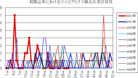 和歌山市の患者報告数は、2012年第5週7件(定点あたり2.33)の報告がありました。第12週4件(定点あたり1.33)、第16週3件、第21週2件、それ以降、0〜1件で推移しています。全国では、過去5年間の同時期と比較してかなり多い報告数が続いています。