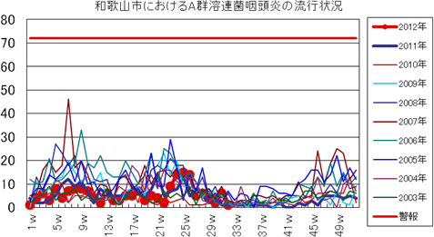 和歌山市の患者報告数は、2012年第5週7件(定点あたり2.33)の報告がありました。第12週4件(定点あたり1.33)、第16週3件、第21週2件、それ以降、0〜1件で推移しています。全国では、過去5年間の同時期と比較してかなり多い報告数が続いています。