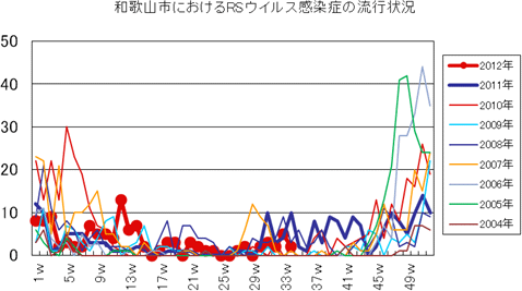 和歌山市の患者報告数は、2012年第21週1件(5ヶ月未満)、第22週1件(7歳)であり、第33週は5件(定点あたり0.56)の報告があり、年齢構成別の数は、10〜14歳2件、15〜19歳1件、20歳以上2件でした。第34週は報告がありませんでした。