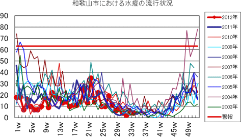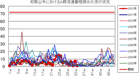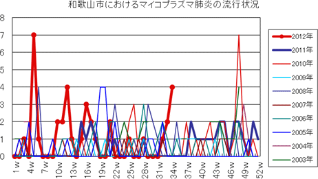 和歌山市の患者報告数は、2012年第5週7件(定点あたり2.33)の報告がありました。第12週4件(定点あたり1.33)、第16週3件、第21週2件、それ以降、0〜2件で推移していましたが、第34週は4件と増加しました。全国では、過去5年間の同時期と比較してかなり多い報告数が続いています。