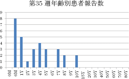 今シーズン(2011-2012シーズン)は、第28週以降、10件以下の報告が続きましたが、第45週に20件と急増し、その後も20件前後の報告が続きました。2012年に入り報告数が減少し、10件前後で推移し、第11週22件(定点当り2.44)、その後、第20週26件、第22週35件(定点あたり3.89)、第23週21件とピークがありました。その後、減少し、第27週19件(定点あたり2.11)と再度増加しました。第30週8件(定点あたり0.89)、第31週4件(定点あたり0.44)、第32週2件(定点あたり0.22)と2週連続減少しましたが、第33・34週4件(定点あたり0.44)でした。第35週は8件(定点あたり0.89)と増加しました。