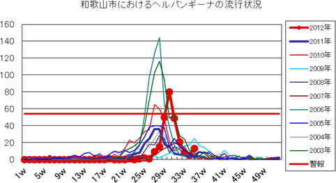 和歌山市の患者報告数は、2012年第21週1件(5ヶ月未満)、第22週1件(7歳)であり、第33週は5件(定点あたり0.56)の報告があり、年齢構成別の数は、10〜14歳2件、15〜19歳1件、20歳以上2件でした。第34・35週は報告がありませんでした。