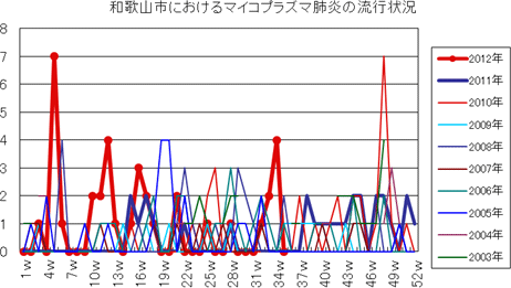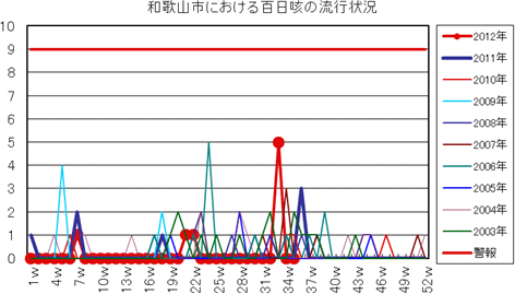 和歌山市の患者報告数は、2012年第5週7件(定点あたり2.33)の報告がありました。第12週4件(定点あたり1.33)、第16週3件、第21週2件、それ以降、0〜2件で推移していましたが、第34週4件と増加しました。第35週は、報告はありませんでした。