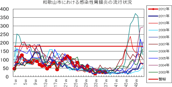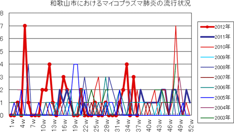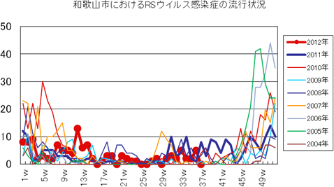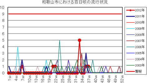 和歌山市の患者報告数は、2012年第21週1件(5ヶ月未満)、第22週1件(7歳)であり、第33週5件(定点あたり0.56)、第36・37週1件(定点あたり0.11)の報告があり、年齢構成別の数は、1歳未満1件、5〜9歳3件、10〜14歳2件、15〜19歳1件、20歳以上2件でした。