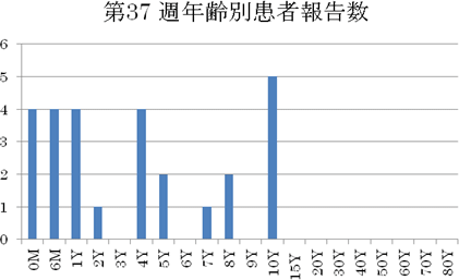 2012年は、10件以下の報告が続きましたが、第24週14件、第25週15件、第26週14件と増加しました。その後、第27週5件、第28週6件、第29週4件、第30週2件、第31週6件、第32週1件でした。第33週は7件と前週より増加しました。第34週1件、第35週0件でした。第36週4件、第37週9件(定点あたり1.00)と増加しました。