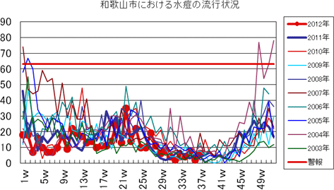 2012年第28週15件(定点あたり1.67)、第29週50件(定点あたり5.56)、第30週80件(定点あたり8.89)と増加しています。第30週は、流行発生警報基準値(定点あたり6)を超えました。第31週49件、第32週21件、第33週8件、第34週5件(定点あたり0.56)と4週連続減少していましたが、第35週は13件(定点あたり1.44)でしたが、第36週6件、第37週4件(定点あたり0.44)と減少しました。流行は終息したと考えられます。
