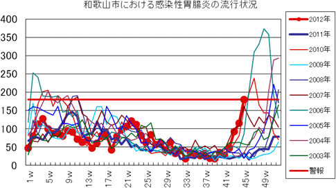 2012年は、第3週113件、第4週128件でしたが、その後、報告数は減少し、第14週47件(定点あたり5.22)となりました。第15週61件、第16週81件、第17週84件(定点あたり9.33)でした。第18週は42件(定点あたり4.67)と減少しましたが、その後、報告数は増加し、第22週122件(定点あたり13.6)、第23週112件となりました。第24週以降、減少し、第33週18件と2012年で最も少ない報告数となりました。第34週35件、第35週31件、第36・37週27件でした。第38週19件、第39週18件、第40週35件、第41週28件でしたが、第42週48件、第43週92件、第44週115件、第45週180件(定点あたり20.0)と4週連続で増加し、今週は警報基準(定点あたり20.0)に達しました。過去5年間の同時期と比較してやや多い状況です。