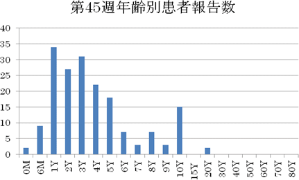 和歌山市の患者報告数は、2012年第5週7件(定点あたり2.33)の報告がありました。第12週4件(定点あたり1.33)、第16週3件、第21週2件、それ以降、0〜2件で推移していましたが、第34週4件と増加しました。第36週3件、第38・39・40週2件でした。第41週は1件と減少しましたが、第42週6件と増加し、第43週0件、第44週4件、第45週0件でした。10歳未満の報告数が全体の約70%を占めています。