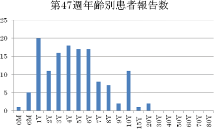 和歌山市の患者報告数は、2012年第5週7件(定点あたり2.33)の報告がありました。第12週4件(定点あたり1.33)、第16週3件、第21週2件、それ以降、0〜2件で推移していましたが、第34週4件と増加しました。第36週3件、第38・39・40週2件でした。第41週は1件と減少しましたが、第42週6件と増加し、第43週0件、第44週4件、第45週0件でした。第46週4件、第47週1件(定点あたり0.33)報告がありました。10歳未満の報告数が全体の約70%を占めています。