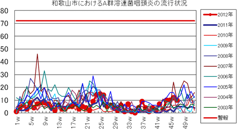 2012年は、第3週113件、第4週128件でしたが、その後、報告数は減少し、第14週47件(定点あたり5.22)となりました。第15週61件、第16週81件、第17週84件(定点あたり9.33)でした。第18週は42件(定点あたり4.67)と減少しましたが、その後、報告数は増加し、第22週122件(定点あたり13.6)、第23週112件となりました。第24週以降、減少し、第33週18件と2012年で最も少ない報告数となりました。第34週35件、第35週31件、第36・37週27件でした。第38週19件、第39週18件、第40週35件、第41週28件でしたが、第42週48件、第43週92件、第44週115件、第45週180件、第46週202件(定点あたり22.4)と増加し、2週連続で警報基準(定点あたり20.0)に達しました。第47週136件(定点あたり15.1)と減少しましたが、警報継続中です。過去5年間の同時期と比較してやや多い状況です。
