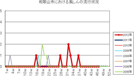 2010年、2011年は報告なく、2012年も第36週現在まで、和歌山市内で麻しんの報告はありません。