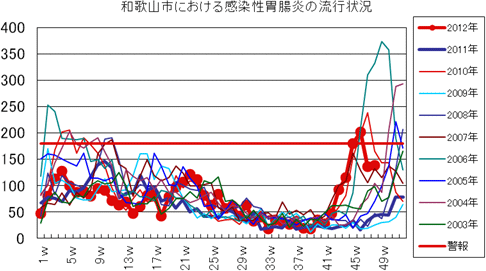 2012年は、第3週113件、第4週128件でしたが、その後、報告数は減少し、第14週47件(定点あたり5.22)となりました。第15週61件、第16週81件、第17週84件(定点あたり9.33)でした。第18週は42件(定点あたり4.67)と減少しましたが、その後、報告数は増加し、第22週122件(定点あたり13.6)、第23週112件となりました。第24週以降、減少し、第33週18件と2012年で最も少ない報告数となりました。第34週35件、第35週31件、第36・37週27件でした。第38週19件、第39週18件、第40週35件、第41週28件でしたが、第42週48件、第43週92件、第44週115件、第45週180件、第46週202件(定点あたり22.4)と増加し、2週連続で警報基準(定点あたり20.0)に達しました。第47週136件、第48週139件(定点あたり15.4)で警報継続中です。過去5年間の同時期と比較してやや多い状況です。