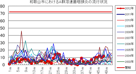 和歌山市の患者報告数は、2012年第5週7件(定点あたり2.33)の報告がありました。第12週4件(定点あたり1.33)、第16週3件、第21週2件、それ以降、0〜2件で推移していましたが、第34週4件と増加しました。第36週3件、第38・39・40週2件でした。第41週は1件と減少しましたが、第42週6件と増加し、第43週0件、第44週4件、第45週0件でした。第46週4件、第47週1件、第48週2件(定点あたり0.67)の報告がありました。10歳未満の報告数が全体の約70%を占めています。