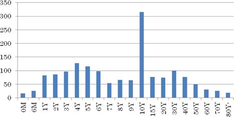 | 0歳 | 1歳 | 5歳 | 10歳 | 15歳 | 20歳 | 25歳 | 30歳 | 35歳 | 40歳 | 計 | |