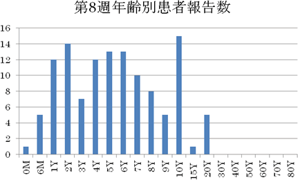 2013年第1週32件、第2週85件、第3週75件、第4週85件、第5週82件第6週85件、第7週64件(定点あたり7.11)でした。今週は121件(定点あたり13.4)と前週より大きく増加しました。