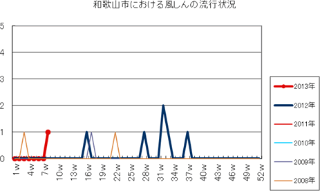 2010年、2011年、2012年は報告なく、2013年も第8週現在まで、和歌山市内で麻しんの報告はありません。