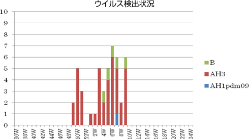 2013年第9週の患者報告数は、345件(定点あたり23.0)で、前週(318件)より増加しました。2012-2013年シーズン(2012年36週以降)は、2012年第47週1件、第49週2件、第50週15件、第51週53件、第52週38件、2013年1週13件、第2週125件、第3週217件、第4週428件、第5週380件、第6週325件、第7週290件でした。38検体の遺伝子検査を実施した結果、AH3型(A香港型)40例、AH1pdm09型1例、B型5例でした。全国的には第4週をピークに患者数は減少傾向です。第50週に流行開始の指標である1.00を初めて上回り、第3週に注意報レベルを超えました。また、全国では、今シーズン、AH3が最も多く検出されています。