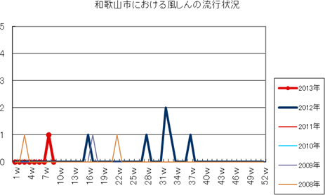 2010年、2011年、2012年は報告なく、2013年も第9週現在まで、和歌山市内で麻しんの報告はありません。