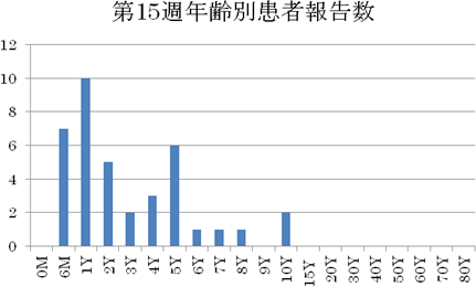 2013年第1週4件、第2週15件、第3週10件、第4・5週は6件、第6週は9件、第7・8週6件、第9週12件、第10週20件、第11週16件、第12週31件、第13週15件、第14週14件(定点あたり1.56)でした。今週は11件(定点あたり1.22)で前週より減少しました。