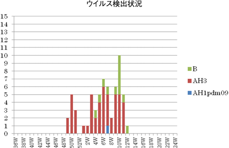 2013年第16週の患者報告数は、39件(定点あたり2.60)で、前週(28件)より増加しましたが、全体的には終息傾向です。2012-2013年シーズン(2012年36週以降)は、2012年第47週1件、第49週2件、第50週15件、第51週53件、第52週38件、2013年1週13件、第2週125件、第3週217件、第4週428件、第5週380件、第6週325件、第7週290件、第8週318件、第9週345件、第10週333件、第11週300件、第12週259件、第13週143件、第14週67件でした。54検体の遺伝子検査を実施した結果、AH3型(A香港型)49例、AH1pdm09型1例、B型12例でした。全国的には第4週をピークに患者数は減少傾向です。今シーズン、AH3が最も多く検出されています。