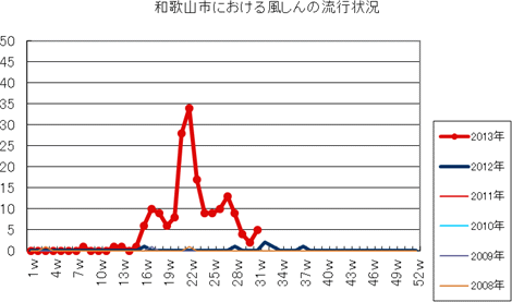風しんは、現在、関東地方と近畿地方の都市部を中心に、報告があります。成人男性を中心に感染しており、流行している地域では、学校内・職場・施設内での集団発生や妊婦や妊婦の家族での感染も報告されています。和歌山市内における風しんの報告数は、2012年は、第16週1件、第28週1件、第32週2件、第33週1件、第37週1件、第38週1件でした。2013年は、第31週5件、第30週2件、第29週4件、第28週9件、第27週13件、第26週10件、第25・24週9件、第23週17件、第22週34件、第21週28件、第20週8件、第19週6件、第18週9件、第17週10件、第16週6件、第15週1件、第13週1件、第12週1件、第8週1件の報告がありました。