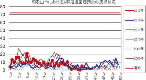 和歌山市の患者報告数は、2013年第1週の報告数は1件でした。第2・3週は0件、第4週は1件、第5週以降は0件でしたが、第12週2件(定点あたり0.67)、第14・15・16週1件、第27週1件、第30・33週・35週1件(定点あたり0.33)の報告がありました。