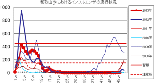 和歌山市内におけるインフルエンザの報告数は、2013年シーズンは、第42週1件、第45週3件、第46週2件、第47週1件、第49・50週3件ありました。発生状況の詳細はこちらへ。