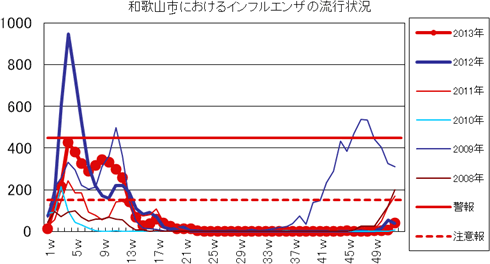 和歌山市内におけるインフルエンザの報告数は、2013年シーズンは、第42週1件、第45週3件、第46週2件、第47週1件、第49・50週3件、第51週6件、第52週40件(定点あたり2.67)ありました。発生状況の詳細はこちらへ。
