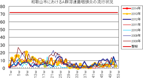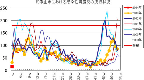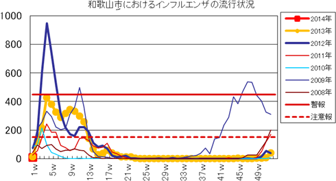 和歌山市内におけるインフルエンザの報告数は、2013年シーズンは、第42週1件、第45週3件、第46週2件、第47週1件、第49・50週3件、第51週6件、第52週40件ありました。2014年第1週は11件(定点あたり0.73)と前週より減少しました。発生状況の詳細はこちらへ。