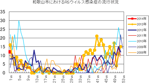 2013年第33・34週2件、第35週10件、第36週12件、第37週11件、第38週13件、第39週11件、第40週13件、第41週21件、第42週16件、第43週19件、第44週16件、第45週9件、第46週11件、第47週15件、第48週11件、第49週17件、第50週4件、第51週11件、第52週15件でした。2014年第1週は12件(定点あたり1.33)と前週より減少しました。過去5年間の同じ時期としてかなり多くなっています。年齢別では2歳以下の小児が80%以上を占めています。注意が必要です。