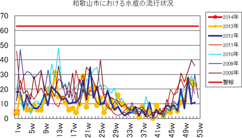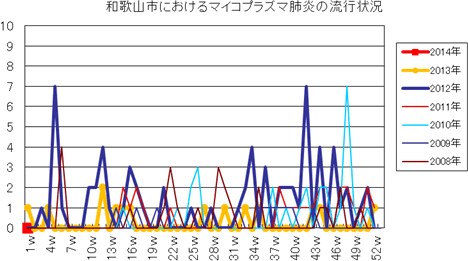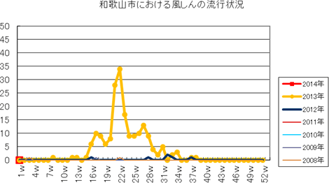 和歌山市の患者報告数は、2014年第1週の報告数は0件でした。2013年第2・3週は0件、第4週は1件、第5週以降は0件でしたが、第12週2件(定点あたり0.67)、第14・15・16週1件、第27週1件、第30・33週・35・43・44週1件、第52週1件(定点あたり0.33)の報告がありました。