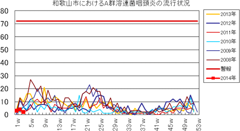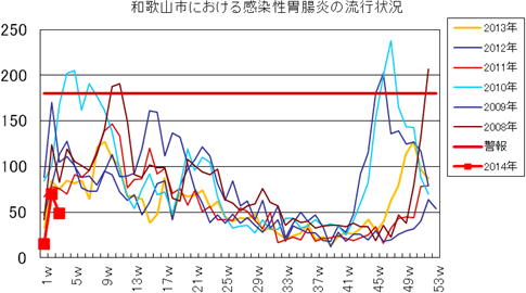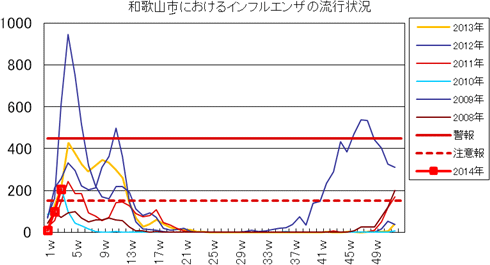 和歌山市内におけるインフルエンザの報告数は、2013年シーズンは、第42週1件、第45週3件、第46週2件、第47週1件、第49・50週3件、第51週6件、第52週40件ありました。2014年第1週11件、2週100件(定点あたり6.67)で、今週は205件(定点あたり13.7)と前週より大幅に増加しました。発生状況の詳細はこちらへ。