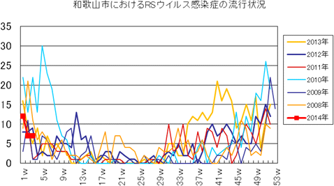 2013年第33・34週2件、第35週10件、第36週12件、第37週11件、第38週13件、第39週11件、第40週13件、第41週21件、第42週16件、第43週19件、第44週16件、第45週9件、第46週11件、第47週15件、第48週11件、第49週17件、第50週4件、第51週11件、第52週15件でした。2014年第1週12件、第2・3週は7件(定点あたり0.78)でした。過去5年間の同じ時期としてかなり多くなっています。年齢別では2歳以下の小児が80%以上を占めています。注意が必要です。