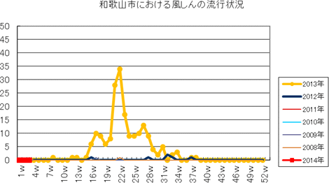 和歌山市の患者報告数は、2014年第1・2・3週の報告数は0件でした。2013年第2・3週は0件、第4週は1件、第5週以降は0件でしたが、第12週2件(定点あたり0.67)、第14・15・16週1件、第27週1件、第30・33週・35・43・44週1件、第52週1件(定点あたり0.33)の報告がありました。