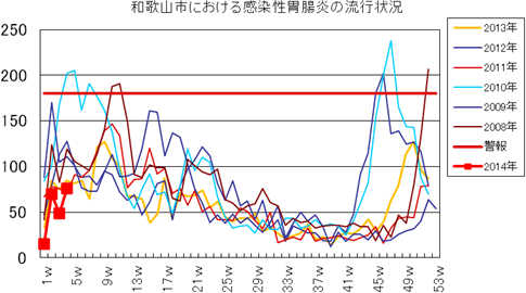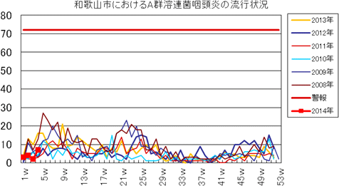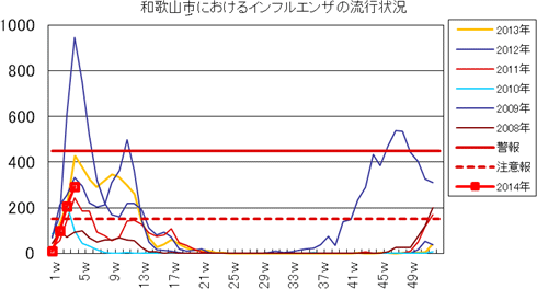 和歌山市内におけるインフルエンザの報告数は、2013年シーズンは、第42週1件、第45週3件、第46週2件、第47週1件、第49・50週3件、第51週6件、第52週40件ありました。2014年第1週11件、2週100件、3週205件で、今週は293件(定点あたり19.5)と3週連続で増加しました。発生状況の詳細はこちらへ。