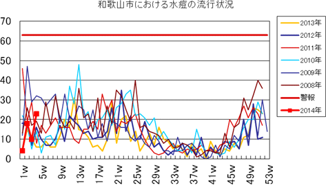 和歌山市の患者報告数は、2014年第1・2・3週の報告数は0件でした。2013年第2・3週は0件、第4週は1件、第5週以降は0件でしたが、第12週2件(定点あたり0.67)、第14・15・16週1件、第27週1件、第30・33週・35・43・44週1件、第52週1件(定点あたり0.33)の報告がありました。
