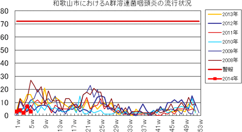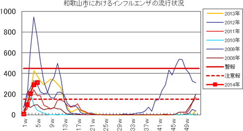 和歌山市内におけるインフルエンザの報告数は、2013年シーズンは、第42週1件、第45週3件、第46週2件、第47週1件、第49・50週3件、第51週6件、第52週40件ありました。2014年第1週11件、2週100件、3週205件、4週293件で、今週は313件(定点あたり20.9)と4週連続で増加しました。発生状況の詳細はこちらへ。