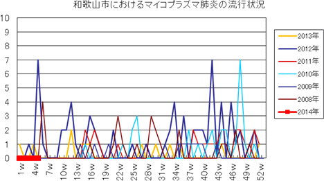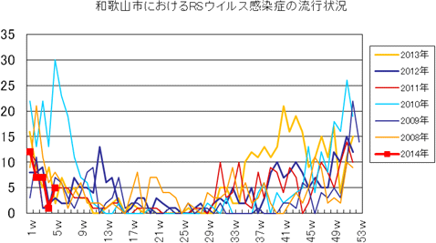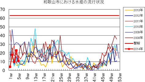 和歌山市の患者報告数は、2014年第1・2・3・4・5週の報告数は0件でした。2013年第2・3週は0件、第4週は1件、第5週以降は0件でしたが、第12週2件(定点あたり0.67)、第14・15・16週1件、第27週1件、第30・33週・35・43・44週1件、第52週1件(定点あたり0.33)の報告がありました。