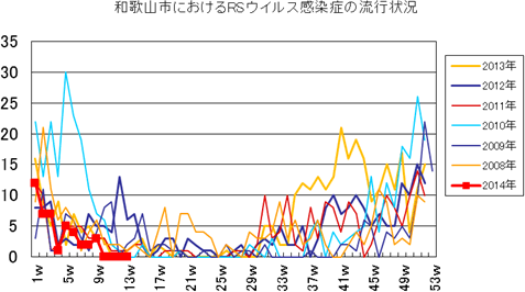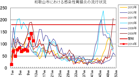 和歌山市内におけるインフルエンザの報告数は、2013年シーズンは、第42週1件、第45週3件、第46週2件、第47週1件、第49・50週3件、第51週6件、第52週40件ありました。2014年第1週11件、2週100件、3週205件、4週293件、5週313件と4週連続で増加しましたが、6週211件、7週205件、8週175と2週連続減少しました。9・10週は231件、11週は322件と再度増加しました。12週は226件(定点あたり15.1)と減少しました。発生状況の詳細はこちらへ。