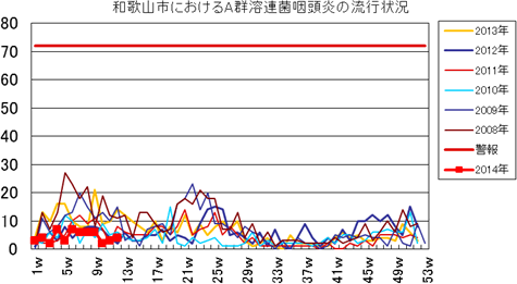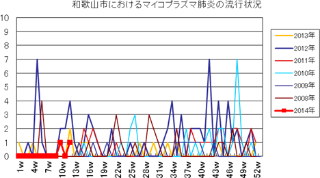 和歌山市の患者報告数は、2014年10週1件、12週1件です。2013年第2・3週は0件、第4週は1件、第5週以降は0件でしたが、第12週2件(定点あたり0.67)、第14・15・16週1件、第27週1件、第30・33週・35・43・44週1件、第52週1件(定点あたり0.33)の報告がありました。
