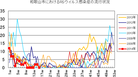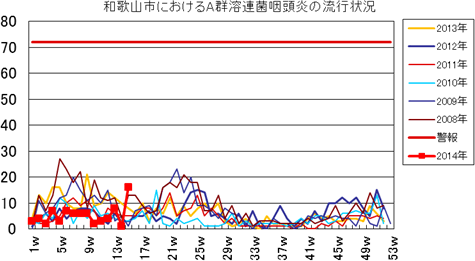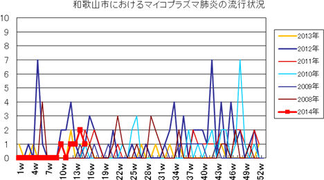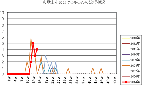 和歌山市の患者報告数は、2014年10週1件、12・13週1件、14週2件、今週は1件でした。2013年第2・3週は0件、第4週は1件、第5週以降は0件でしたが、第12週2件(定点あたり0.67)、第14・15・16週1件、第27週1件、第30・33週・35・43・44週1件、第52週1件(定点あたり0.33)の報告がありました。