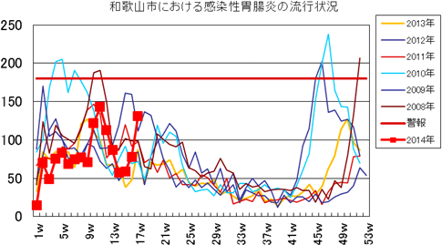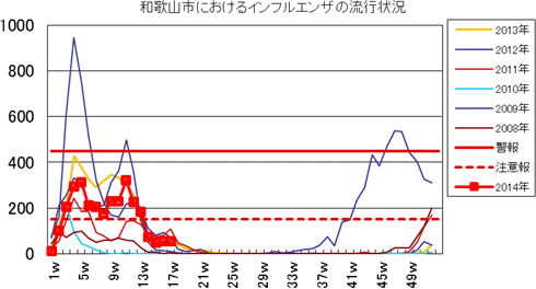和歌山市内におけるインフルエンザの報告数は、2013年シーズンは、第42週1件、第45週3件、第46週2件、第47週1件、第49・50週3件、第51週6件、第52週40件ありました。2014年第1週11件、2週100件、3週205件、4週293件、5週313件と4週連続で増加しましたが、6週211件、7週205件、8週175と2週連続減少しました。9・10週は231件、11週は322件と再度増加しました。12週226件、13週182件、14週74件、15週48件と4週連続で減少しました。16週54件、17週53件(定点あたり3.53)でした。発発生状況の詳細はこちらへ。