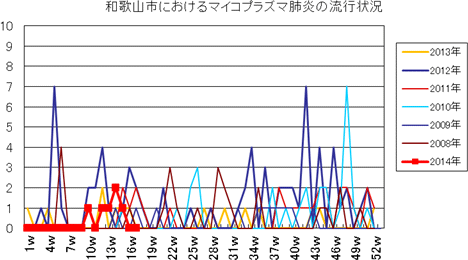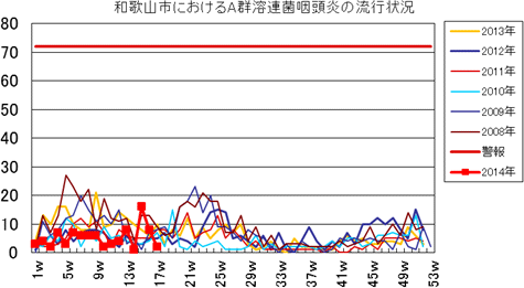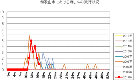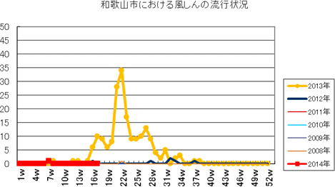 和歌山市の患者報告数は、2014年10週1件、12・13週1件、14週2件、第15週1件、第16・17週は0件でした。2013年第2・3週は0件、第4週は1件、第5週以降は0件でしたが、第12週2件(定点あたり0.67)、第14・15・16週1件、第27週1件、第30・33週・35・43・44週1件、第52週1件(定点あたり0.33)の報告がありました。