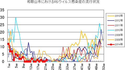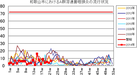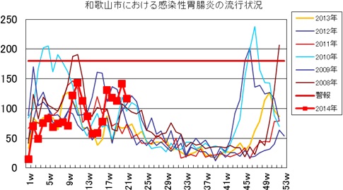 和歌山市の患者報告数は、2014年10週1件、12・13週1件、14週2件、第15週1件、第19週1件、第20週1件でした。2013年第2・3週は0件、第4週は1件、第5週以降は0件でしたが、第12週2件(定点あたり0.67)、第14・15・16週1件、第27週1件、第30・33週・35・43・44週1件、第52週1件(定点あたり0.33)の報告がありました。