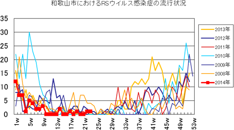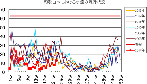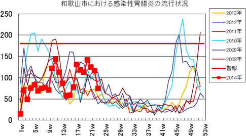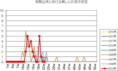 和歌山市の患者報告数は、2014年10週1件、12・13週1件、14週2件、第15週1件、第19週1件、第20週1件でした。2013年第2・3週は0件、第4週は1件、第5週以降は0件でしたが、第12週2件(定点あたり0.67)、第14・15・16週1件、第27週1件、第30・33週・35・43・44週1件、第52週1件(定点あたり0.33)の報告がありました。
